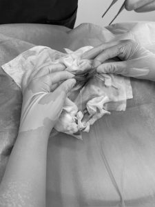一箇所ずつ腸切開を行い、紐をゆっくり引っ張っていきます。