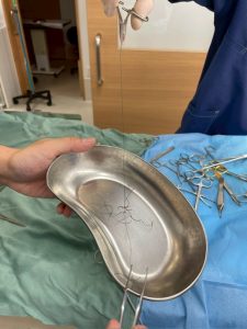 引っ張っても紐が抜けない箇所があれば、その箇所を腸切開し、紐を引っ張る、、というのを繰り返していきます。